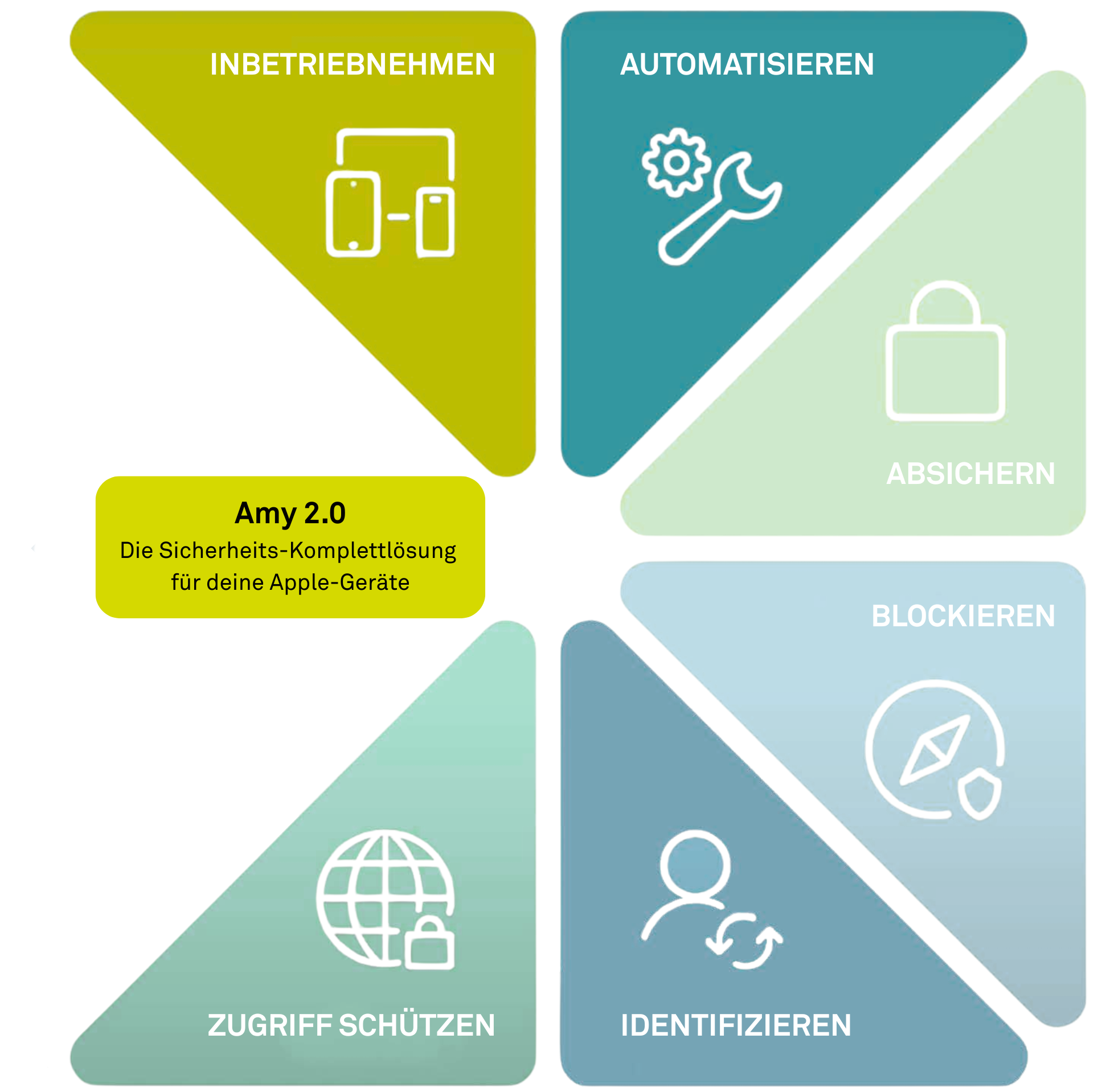Mit der Amy 1.0 haben wir eine nutzerfreundliche Lösung geschaffen, die es erlaubt, iPad und Mac professionell zu verwalten. Doch die Anforderungen wachsen. Deshalb haben wir Amy weiterentwickelt: Die Amy 2.0 ist keine reine MDM-Lösung mehr, sondern eine ganzheitliche Endgeräte- und Sicherheitsplattform.