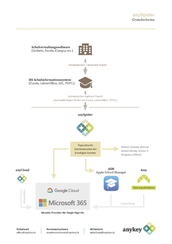 «Die anySpider stellt den automatischen und tagesaktuellen Datenabgleich zwischen Schulinformationssystemen, Cloud-Diensten wie beispielsweise M365 und diversen Lernplattformen sicher. Du pflegst nur noch eine Datenbank und alle notwendigen Schul-Zugänge werden automatisch erstellt oder angepasst.»
